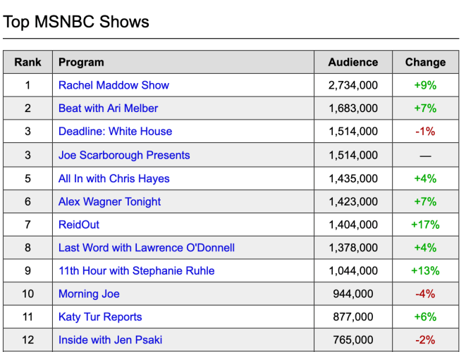 Current ratings show ‘Inside with Jen Psaki’ as the 12th ranked program on MSNBC, recently shedding 2% of their audience. See those rankings for shows airing on MSNBC below…
